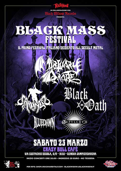Il 23 MARZO al CRAZY BULL Cafè di Genova si terrà il primo BLACK MASS FESTIVAL, evento dedicato all’ Occult Rock, ovvero ai gruppi metal, doom, dark, gothic, black, stoner, psyck, prog… che con le loro composizioni, trattano tematiche oscure, esoteriche e, diciamolo pure, occulte.