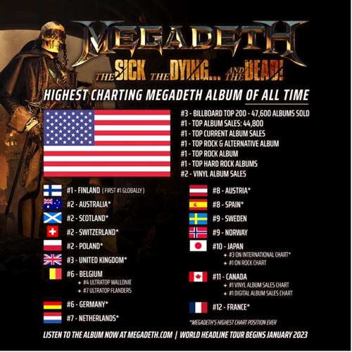 I MEGADETH debuttano in cima alle classifiche con il loro nuovo album “The Sick, The Dying… And The Dead!” nella prima settimana di vendite, conquistando la posizione n. 3 della Billboard 200;