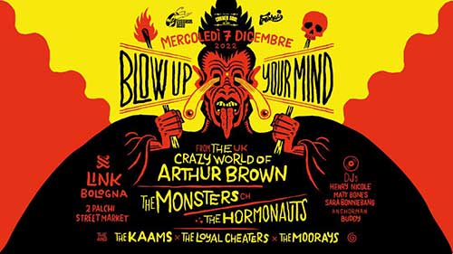 Vedete, quando la maggior parte di voi eravate in fasce o nemmeno concepita, Arthur Brown veniva arrestato a Palermo per essersi esibito sul palco completamente nudo, uno dei tanti spettacoli nei quali si spingeva OLTRE i limiti. Il suo singolo più famoso, “Fire”, non solo anticipa tematiche che poi saranno sia il pane che i denti di qualsiasi forma di rock, metal e contenuti di tendenza misteriosa o occulta… ma sarà un brano oggetto di cover da parte di… beh… tutti, principe delle tenebre -Ozzy Osbourne- compreso. Arthur ha recitato in “Tommy”, il film basato sul disco di The Who… ha suonato con Carl Palmer, ovvero il Palmer di Emerson, Lake & Palmer; Arthur ha lavorato con lan Parsons Project, David Gilmore, The Prodigy, Bruce Dickinson, The Stranglers, Kula Shaker e Die Krupps. E chissà quanti altri.
