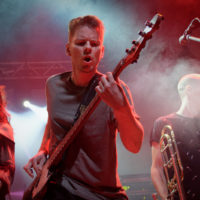 I GIVES US BARABBA sono dei piccoli geni con una grande dose di ironia ed una infinita quantità di autoironia, caratteristiche che sul palco vengono tutt’altro che nascoste. Loro sono in cinque (o forse quattro… il nuovo chitarrista è entrato in scena a metà del primo brano e durante il concerto è stato pure cacciato, anche se poi amorevolmente reintegrato)… ma sul palco cantano in due, c’è un sassofono, una tastiera, un’ottima batteria, il basso… insomma una specie di moltiplicazione divina e miracolosa dei componenti polivalenti del gruppo.