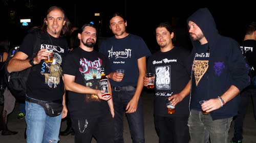 Fuori dal locale -complice una serata dal clima mite- si vedono circolare, tra i vari personaggi, gli artisti della serata. Si nota Algol, probabilmente in modalità predatore. Asher conversa con molti fans ed addetti ai lavori. Si materializzano personaggi noti della scena, promoter di date future, membri di bands locali in visita – ed in atteggiamento mistico- per vedere quegli animali che sarebbero poi saliti sul palco. I Nocturnal Depression sono quelli più girovaghi ed ad un certo punto me li vedo tutti assieme, tranquilli, chiacchierando tra di loro.