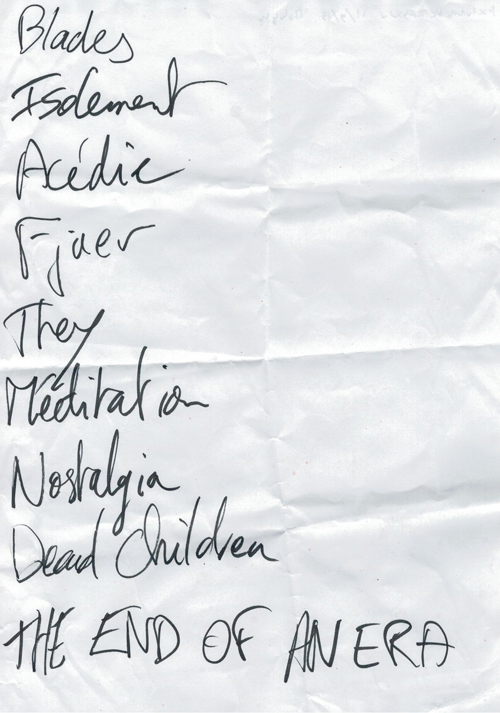 La set list è esaltante: pezzi storici, profondi, alcuni che poi -per problemi di tempo- non sono stati suonati nelle date successive, regalando agli spettatori di Bologna uno spettacolo quasi unico. (Nota: l’ultima canzone non esiste ed il titolo se l’è inventato il batterista che ha compilato la lista. “Fjaer” è “Spring”. Secondo la band è il nome della canzone in Norvegese.)