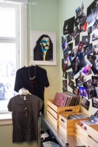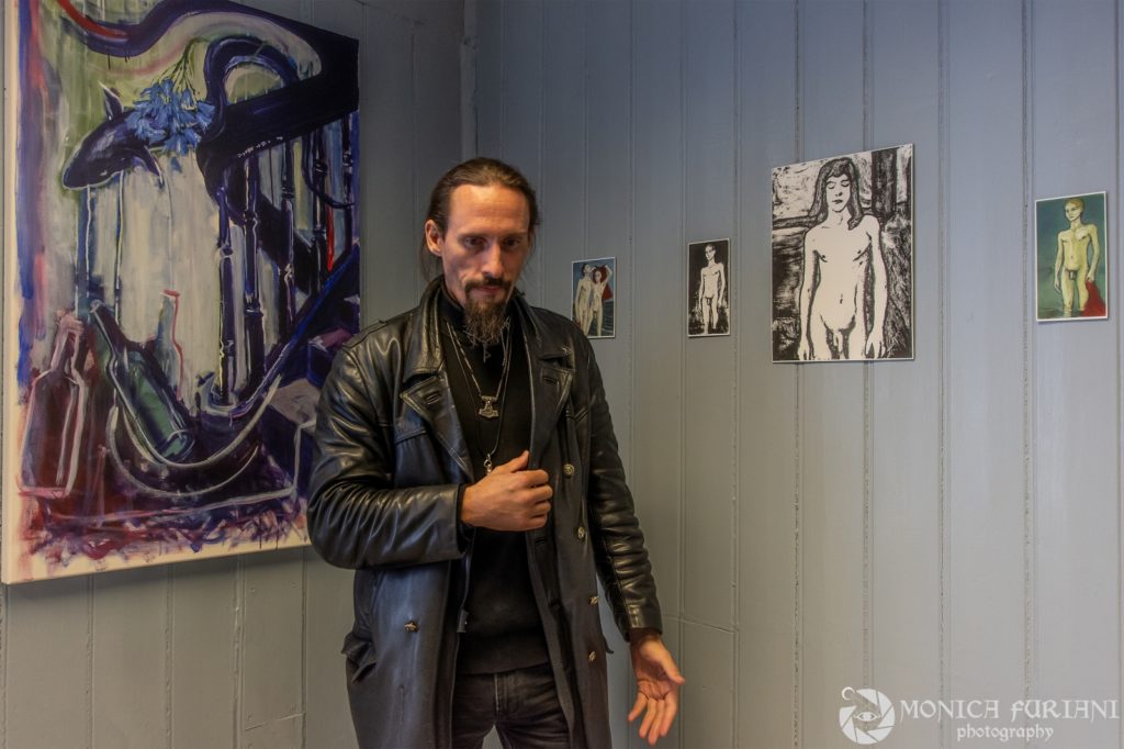 Gaahl era lì. Ci saluta educatamente e ci invita ad entrare. L’esposizione in corso era composta da opere su tela di Erlend Erichsen (ex batterista di Gorgoroth e Molested), esposizione che giovedì lascerà spazio alle opere di Trine Grimm, nota per aver disegnato molte copertine.