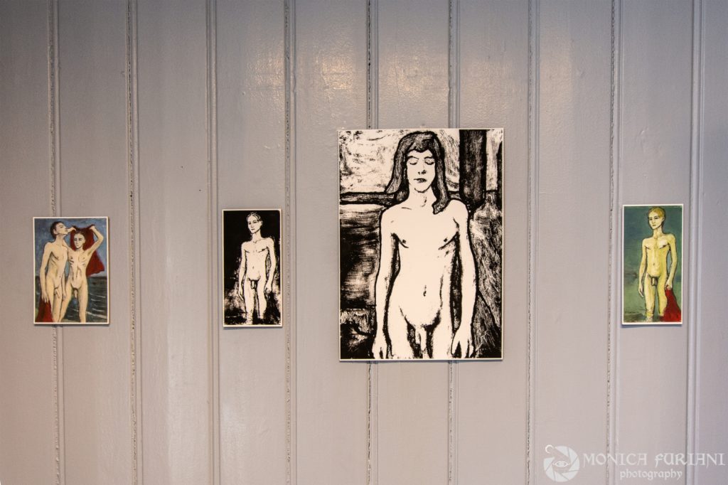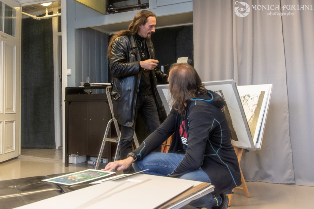 La sala è elegante. Intenzionalmente spoglia, legno, edificio storico di Bergen. Solo un divanetto al centro per ammirare le opere anche da seduti. Le opere di Erlend Erichsen mi attirano, mi fanno fantasticare, ma una in particolare mi lascia perplesso e confuso. Monica, tra uno scatto e l’altro, mi regala la sua interpretazione… ma poi Gaahl rivela la sua geniale visione, la visione di un artista poliedrico, che include la pittura tra il ventaglio delle sue arti. In una elegante conversazione, discutiamo dei nostri rispettivi punti di vista, su quale elemento criptico del dipinto che ci lascia rispettivamente confusi.