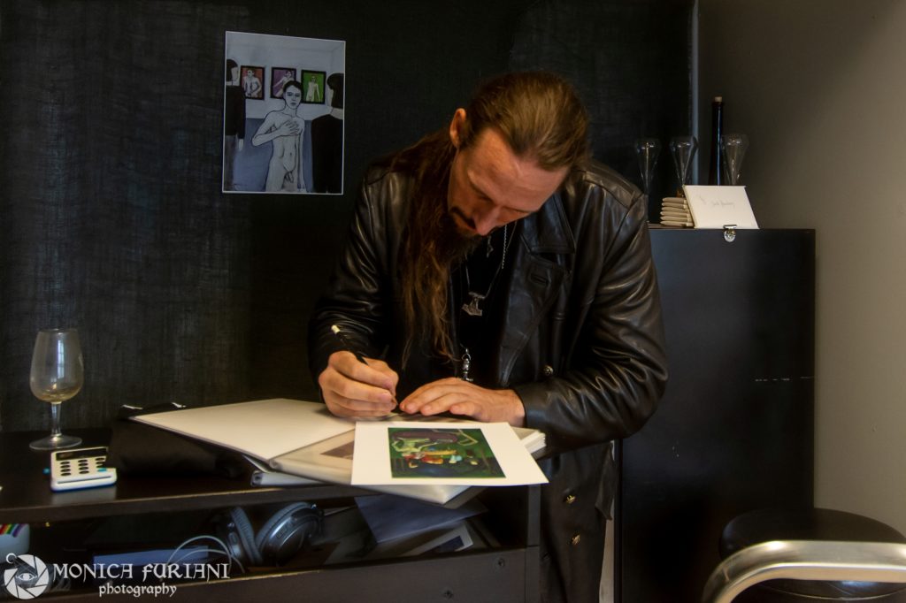 Le risate portano verso le sue opere esposte ed in vendita in un raccoglitore. Chiedo prezzi, ammiro alcuni dipinti (tutti ad olio), chiedo significati, esprimo interpretazione. Ad un certo punto decido che mi merito un regalo: voglio una stampa, e la voglio dalle mani dell’artista. Gaahl è scherzosamente d’accordo relativamente alle mie intenzioni di autocompiacimento, ma è anche la scintilla che avvia un dialogo interessante, il dialogo che puoi avere solo con un artista quando ti dimostri interessato alla sua arte ad un livello che va oltre l’ovvio, il visibile ed il palese.