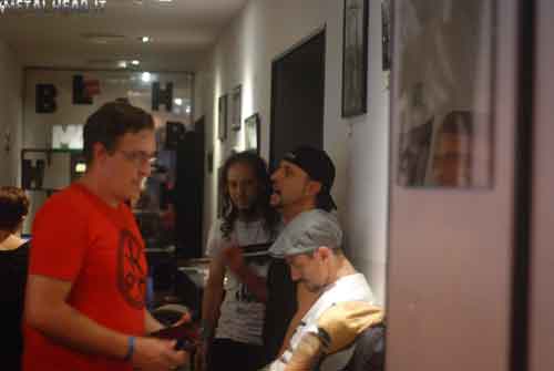 Il dopo-concerto è da favola. La ventata di classe e adrenalina dei tre viene accantonata da quella rinnovata atmosfera da ‘serata tra noi’. I tre si recano al banco del merchandising accanto al mixer, dove si scatena un vortice di autografi scritti ovunque: su agende, foglietti, volantini della serata, brochure della UDR (l’etichetta della band), pelli di batteria, CD, vinili (qualcuno con quelli degli Slayer) e décolltè! Foto per tutti, ovviamente, tra sorrisi e mani a corna sempre esibite.
