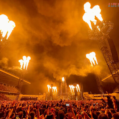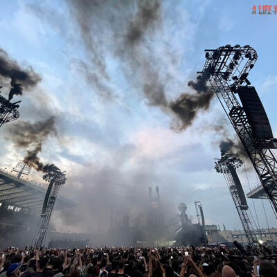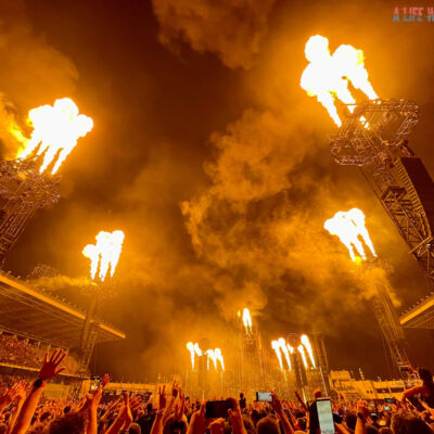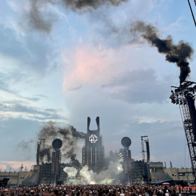 Mi sorprende pensare che i Rammstein siano in giro da trent’anni, tanto tempo è passato da quando comprai “Herzeleid” e poi “Sehnsucht”; mi sorprende vedere che la maggior parte del pubblico non aveva nulla a che fare con la scena metal, ovvero in qualche modo la scena principale di questa band. Ma il brand Rammstein è ormai oggetto di fama, di culto, è una possente influenza mediatica: ragazzi e ragazze, nonni tatuati con maglietta in tema, imprenditori di mezza età palesemente lontani dal mondo dei concerti negli stadi… tra l’altro abbigliati in modo totalmente fuori luogo, come se stessero facendo la passeggiata lungomare durante le consuete e noiose ferie d’agosto in famiglia. Gente in costume, gente strana. Un tizio vestito con un costume di una cazzo di Biancaneve tossica, ragazze con costumi tradizionali bavaresi in chiave punk.