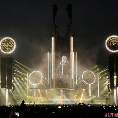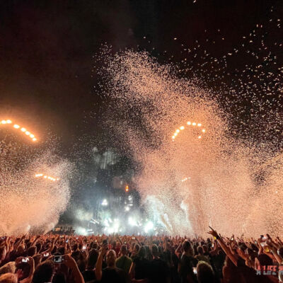 Un palcoscenico mostruoso, vasto, tirannico… con effetti pirotecnici micidiali… con esplosioni letali, fiamme infernali e fumi tossici… prendendo in giro tutti, strizzando l’occhio alle infinite accuse che -negli anni- altro non hanno fatto che alimentare l’ego e potenza scenica di questa band colossale.