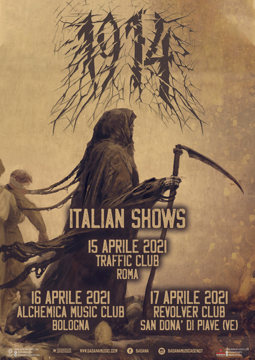 Posticipati di un anno esatto gli appuntamenti italiani degli ucraini 1914 con il loro blackened death / doom metal, a cui si aggiunge una data a Roma. La formazione sarà in Italia per tre unici appuntamenti: giovedì 15 aprile 2021 al Traffic Club di Roma, venerdì 16 aprile 2021 all’Alchemica Music Club di Bologna e sabato 17 aprile 2021 al Revolver Club di San Donà di Piave (VE). I biglietti già venduti in prevendita rimarranno validi per la nuova data.