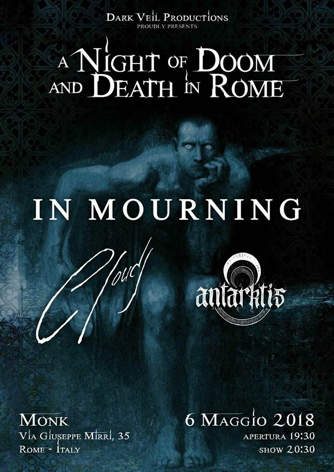 Dalle fredde lande di Vansbro, Svezia, gli IN MOURNING, pregevole gruppo melodic death metal nato nel 2000 dalla sinergia fra musicisti di grande livello provenienti da October Tide, Contortion, Majalis, Volturyion e, nella formazione più recente, da Katatonia con l’arrivo di Daniel Liljekvist dopo una militanza di sedici anni nella storica band. Gli In Mourning consegnano un melodic death molto sinfonico di grande impatto musicale, emotivo e spettacolare anche sul palco, dal quale incantano per potenza e scenograficità. A precedere gli headliners i CLOUDS, altra formazione che sempre attinge alle ambientazioni nordiche e fra band di grande pregio in ambito doom/death. Il loro atmospheric/sad doom è di assoluto valore, elegante e ricco di suggestioni e sonorità avvolgenti. Apriranno la serata gli Antarktis, spin-off degli stessi In Mourning, con il loro sludge/post metal concretizzatosi nel per ora unico bellissimo album “ILDLAANTE”.