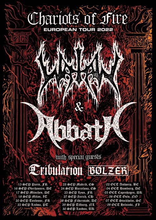 I norvegesi ABBATH e gli svedesi WATAIN saranno co-headliners per il “Chariots of Fire Tour” il quale partendo dalla Francia toccherà tredici ulteriori paesi, Italia compresa, finendo poi in Finlandia.