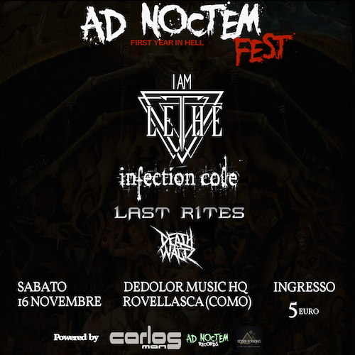 Ad Noctem Records è orgogliosa di annunciare l’AD NOCTEM FEST per festeggiare il primo anno di attività. Sul bellissimo palco del Dedolor Music Headquarter si esibiranno Death Waltz autori di un debut album da urlo, Last Rites col nuovo singolo “Jukai” che sta spopolando, INFECTION CODE guest della serata dal nostro partner Leynir Booking.