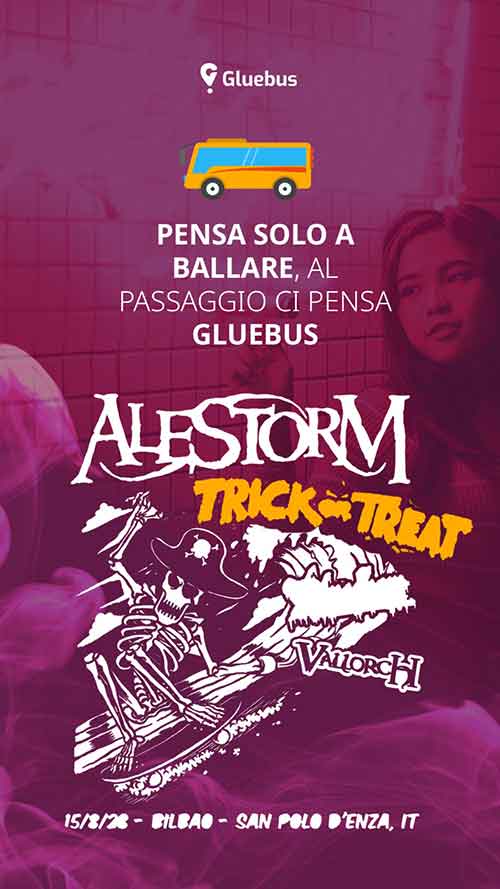 Per il concerto degli Alestorm del 15 agosto, Gluebus mette a disposizione un autobus con partenza prevista da Milano – Cascina Gobba M2 e arrivo direttamente al Bilbao di San Polo d’Enza. Le fermate che effettuerà l’autobus durante il tragitto saranno a Bergamo (Via Pietro Spino 63) e a Brescia (Esselunga Via Volta). Perché il bus parta bisognerà raggiungere una partecipazione di minimo 40 persone.