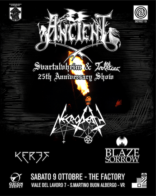 Dopo il recente annullamento dovuto alle misure anti-covid, lo staff del The Factory annuncia che la nuova data dell’evento Ancient – Necrodeath – Keres – Blaze of Sorrow live al The Factory si terrà SABATO 9 OTTOBRE 2021.