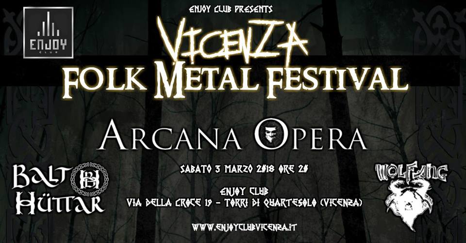 Gli Arcana Opera suoneranno il 3 marzo al VICENZA FOLK METAL FESTIVAL che si terrà all’Enjoy Club Vicenza, ubicato in Via della croce 19, 36040 Torri Di Quartesolo (VI).