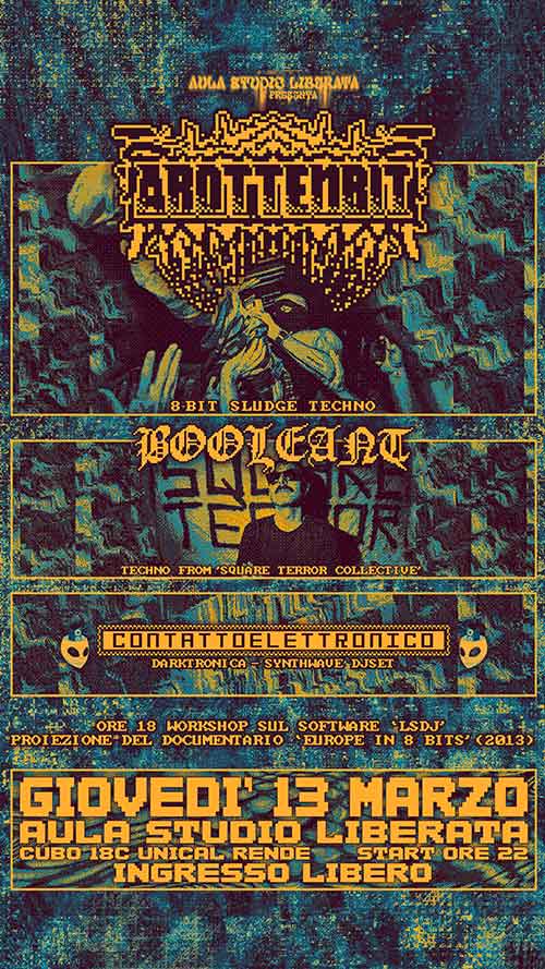 Aula Studio Liberata è pronta con una line-up che mescola elettronica, industrial e sonorità estreme. Arottenbit, uno dei progetti più radicali della scena chiptune metal, affiancato dai set incendiari di b00leant e Contatto Elettronico.