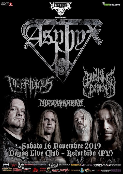 Si avvicina l’unica data italiana degli ASPHYX prevista per il 16 Novembre 2019 al Dagda Live Club di Retorbido. Con loro tre act che andranno ad arricchire l’evento, già imperdibile per tutti gli amanti del genere: i PERFIDIOUS, con il loro death metal feroce e senza compromessi e i THE BURNING DOGMA, capitanati dalla bravissima Jade ed in procinto di pubblicare un nuovo Ep.