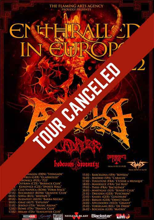 Annullati i tre appuntamenti esclusivi nel nostro Paese per ATHEIST, in compagnia di CADAVER, HIDEOUS DIVINITY, FROM HELL, previsti venerdì 11 febbraio 2022 al Music Hall Arena di Cavallino Treporti (VE), sabato 12 al Traffic Club di Roma e domenica 13 allo Slaughter Club di Paderno Dugnano (MI). È possibile richiedere il rimborso del biglietto entro giovedì 10 febbraio 2022 presso il circuito di prevendita utilizzato per l’acquisto.