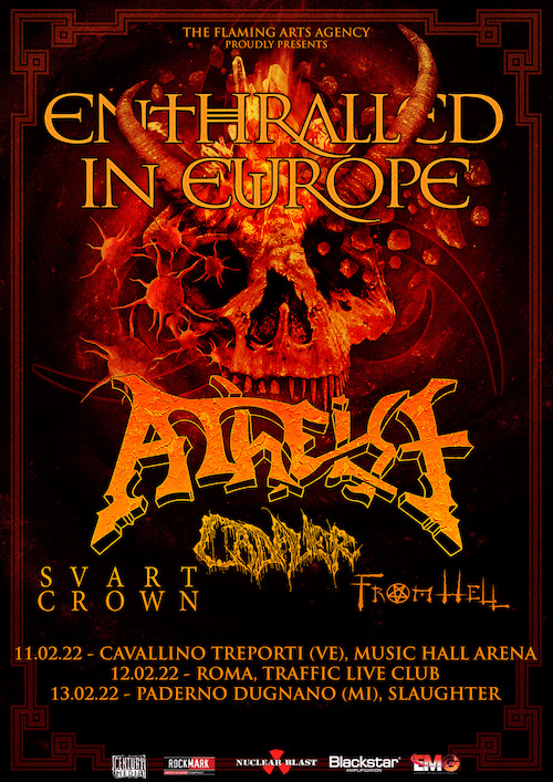 Posticipati nuovamente, al 2022, i tre appuntamenti esclusivi nel nostro Paese per ATHEIST, accompagnati da CADAVER, SVART CROWN e FROM HELL, che tornano dopo lunghi anni di attesa tornano dal vivo in Europa e UK. I concerti saranno venerdì 11 febbraio 2022 al Music Hall Arena di Cavallino Treporti (VE), sabato 12 al Traffic Club di Roma e domenica 13 allo Slaughter Club di Paderno Dugnano (MI). I biglietti già acquistati in prevendita rimangono validi per le nuove date, nuovi ticket sono disponibili sui circuiti: DIYTicket per il concerto a Cavallino (VE), TicketOne per la data a Roma, TicketOne e Mailticket per l’appuntamento milanese.