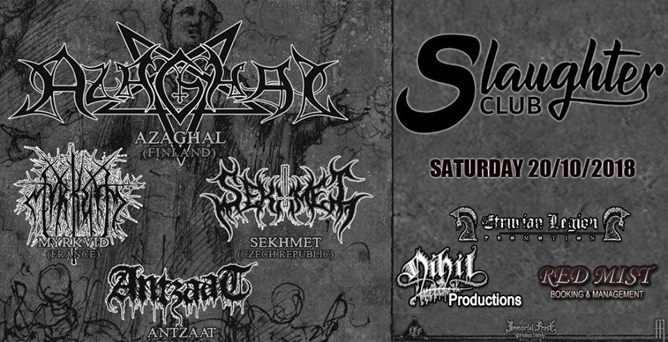 La Etrurian legion promotion, assieme alla Nihil Production e la Red Mist booking presentano una serata in compagnia dei finlandesi Azaghal, accompagnati dai francesi Myrkvid, i cechi Sekhmet ed i belgi Antzaat.