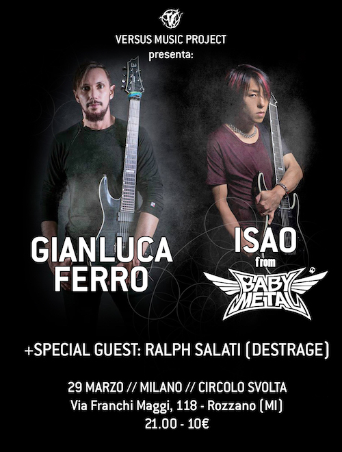 Versus Music Project è felice di invitarvi ad un nuovo evento dedicati agli amanti della chitarra elettrica, dopo il successo dell’evento che ha ospitato lo scorso autunno Angel Vivaldi, Andy James a Sarah Longfield, questa volta sarà sul palco del Circolo Svolta ISAO, fenomenale giapponese chitarrista live delle BABYMETAL. Insieme a lui Gianluca Ferro e Ralph Salati dei DESTRAGE!