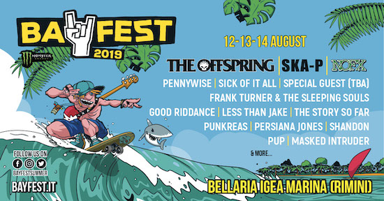 Anche quest’anno il meglio del punk rock italiano sarà di scena al Bay Fest! Ai grandi nomi internazionali annunciati nelle scorse settimane, si aggiungono infatti band nostrane quali Punkreas nel Day 1 (12 agosto con i Nofx), Persiana Jones nel Day 2 (13 agosto con gli Ska-P) e Shandon nel Day 3 (con i The Offspring). L’appuntamento come di consueto è a cavallo di Ferragosto, dal 12 al 14 presso il Parco Pavese di Bellaria Igea Marina (Rimini).