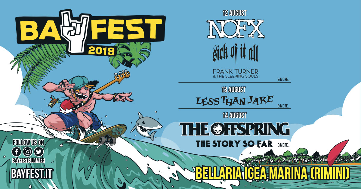 Primo annuncio del 2019 per la prossima edizione del Bay Fest. Dopo The Offspring, Nofx, The Story So Far e Frank Turner annunciati negli ultimi mesi dello scorso anno, la lineup del festival si arricchisce ulteriormente con due nuovi nomi. Presso l’ormai tradizionale Parco Pavese di Bellaria Igea Marina (RN) si esibiranno infatti anche i Sick of It All nella giornata di lunedì 12 agosto, e i Less Than Jake martedì 13 agosto.