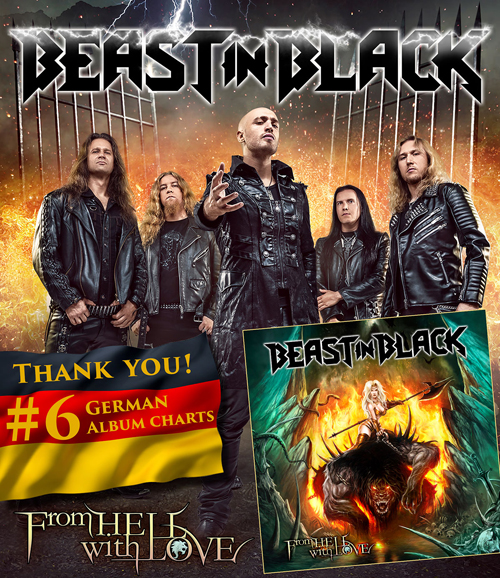 L’8 febbraio i BEAST IN BLACK hanno pubblicato il loro secondo album intitolato “From Hell With Love”. Grazie al costante supporto della loro fanbase leale e in costante crescita, la band finlandese annuncia con orgoglio che il loro nuovo disco è entrato nella classifica tedesca al #6!