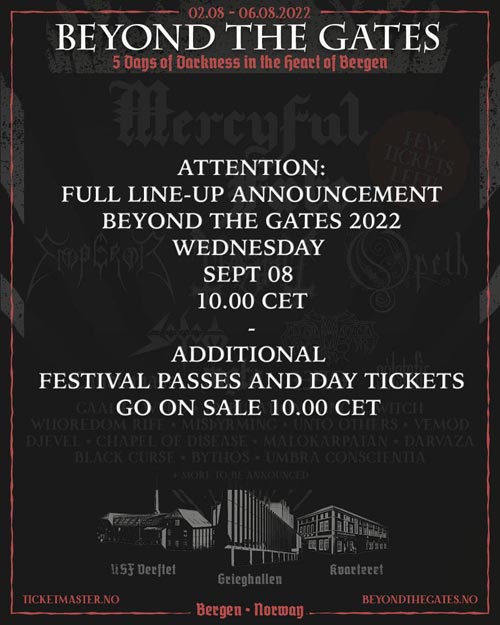 Dopo due rinvii consecutivi, nella speranza che l’edizione 2022 si possa tenere senza intoppi, domani mattina alle 10:00 il festival norvegese BEYOND THE GATES, che si terrà a Bergen dal 2 al 6 agosto 2022, annuncerà il bill completo, oltre a mettere in vendita ulteriori biglietti (sia per il giorno singolo che pass per tutto il festival).