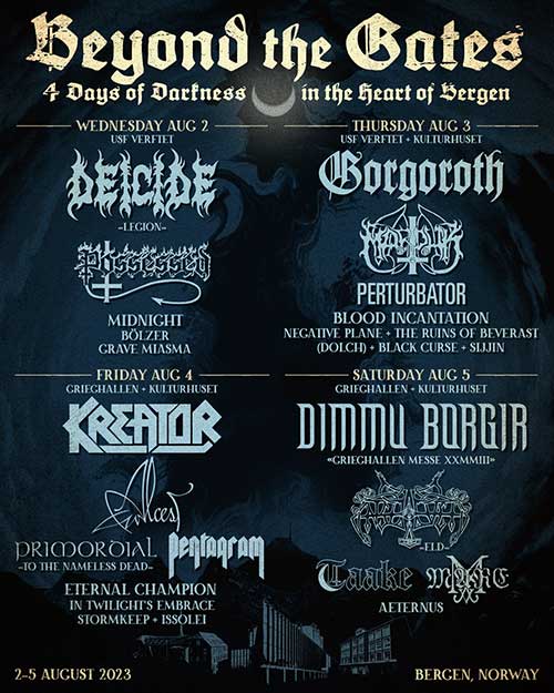 L’organizzazione del BEYOND THE GATES ha svelato il bill completo dell’edizione 2023 del festiva di 4 giorni che si terrà dal 2 al 5 agosto 2023, a Bergen, in Norvegia.