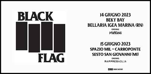 I Black Flag, storica band hardcore punk californiana, tornerà in Italia il 14 e 15 giugno, ovvero al Beky Bay di Bellaria Igea Marina il 14 e il 15 allo Spazio Mil-Carroponte di Sesto San Giovanni. Annunciati chi aprirà i due concerti: a Bellaria Igea Marina saranno i Marrano, rock band riminese attiva dal 2015, mentre a Sesto San Giovanni apriranno i Rappresaglia, storica band della scena hardcore punk italiana.