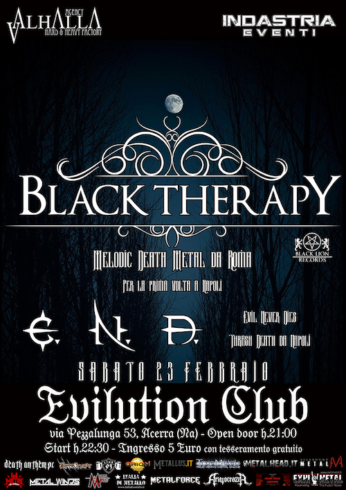 Il prossimo 15 marzo rilasceranno su Black Lion Records il loro terzo album, “Echoes of Dying Memories”: sono i melodic death metallers romani Black Therapy, che a pochi giorni dall’uscita della loro nuova fatica saranno di scena all’Evilution Club di Acerra (NA), per quella che è la loro prima data in assoluto in terra campana. Con un’esperienza internazionale dovuta ai tanti live in Europa, con concerti di supporto a nomi quali Dark Tranquillity, Nile ed Arch Enemy, i Black Therapy sono garanzia di uno show ad alto impatto sonoro quanto emotivo. Uno show in cui, tra l’altro, la band suonerà alcuni dei brani che comporranno “Echoes…”.