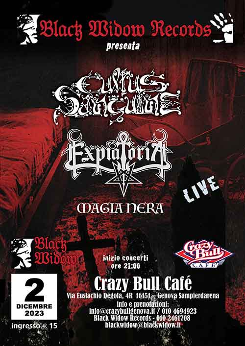 La Black Widow Records organizza un evento doverosamente all’insegna dell’oscurità più heavy e doomy possibile presso il Crazy Bull di Genova. L’etichetta il 2 dicembre prepara il terreno a tre formidabili band: Cultus Sanguine, Expiatoria e Magia Nera.