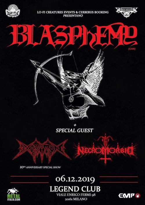 Tornano in Italia le leggende del death-metal canadese: I BLASPHEMY! Attivi dal 1987, con il primo demo “Blood Upon the Altar” inciso nel 1989, rappresentano un esempio ed un punto di riferimento per tutta la scena estrema. Il loro album d’esordio “Fallen Angel of Doom” è considerato un capolavoro del genere e fonte di ispirazione per molte band nel mondo. “Guerra”, “satanismo” e “nessun compromesso” tra i termini più indicati per descrivere la loro intera carriera.