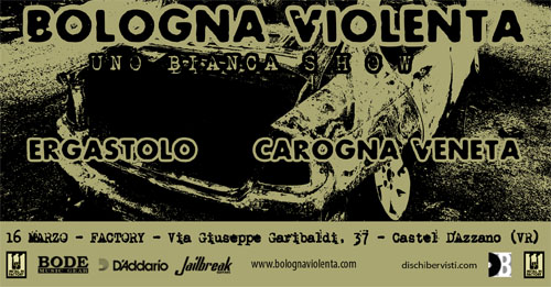 Sabato 16 marzo, il The Factory sarà sotto le bombe sonore dei BOLOGNA VIOLENTA per uno show dedicato al loro ultimo, cattivissimo album dal titolo “Uno bianca”. Prima del progetto del polistrumentista Nicola Manzan coadiuvato da Alessandro Vagnoni, si esibiranno due band veronesi: gli Ergastolo (Metal Grindcore) e i Carogna Veneta (Post-Hardcore Noise).