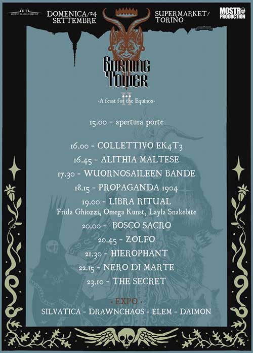 Il 24 settembre di terrà la seconda edizione del Burning Tower festival: Burning Tower – A Feast for the Equinox, arti visive, performance e concerti a Torino.
