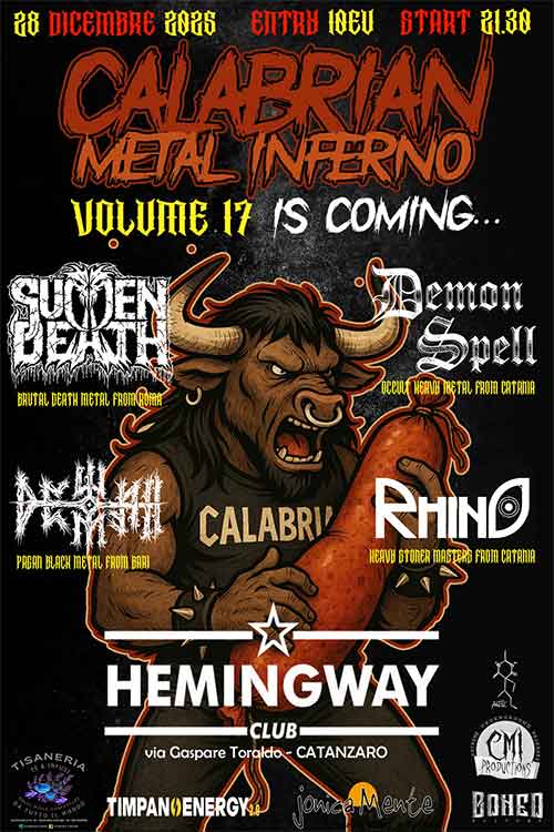Anche quest’anno CMI Productions annuncia il Calabrian Metal Inferno Fest che giunge così alla diciassettesima edizione. Il festival si terrà come di consueto il 28 dicembre a Catanzaro presso l’Hemingway Club.