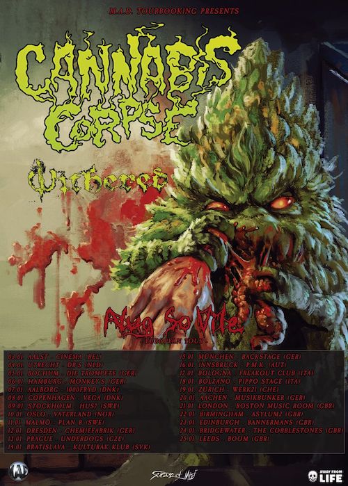 In Europa i Cannabis Corpse da ieri sbarcati ad Aalst in Belgio, per un tour nel nostro continente che durerà almeno fino al 25 gennaio, quando gli statunitensi termineranno a Leeds questa serie di concerti. La stoner band passerà anche dall’Italia, assieme ai Withered, il 17 gennaio a Bologna sul palco del Freakout Club e quello seguente a Bolzano al Pippo Stage.