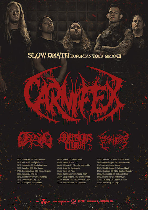 La metal band di San Diego, California, CARNIFEX ha annunciato il tour di “Slow Death” in Europa e Inghilterra per febbraio e marzo 2018. A questo giro sarà supportata dagli OCEANO, AVERSIONS CROWN e DISENTOMB.