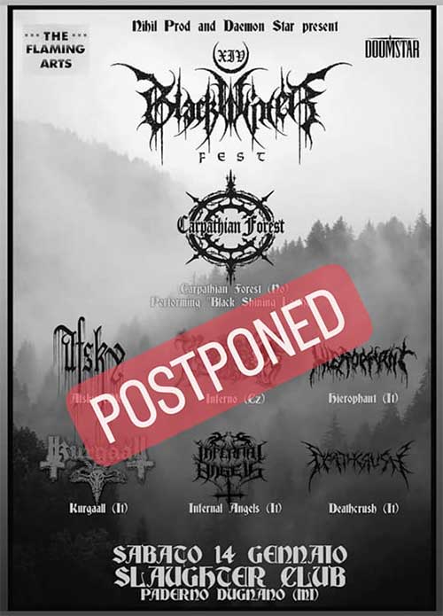 La Nihil, l’organizzazione del Black Winter Fest, e della data di Roma informa: “Abbiamo pensato ad ogni possibile soluzione, ma l’unica alternativa è quella di rimandare il Black Winter e la data di Roma. A breve vi comunicheremo la nuova data e i cambi di line up – con delle sorprese che siamo certi gradirete! Chi avesse già acquistato la prevendita può chiedere un rimborso scrivendo a nihil_management@live.it, oppure tenere il biglietto per la nuova data, che sarà entro e non oltre aprile/maggio 2023. Chi ci segue da tanti anni sa che abbiamo sempre rispettato la parola data, ma purtroppo davanti a questi imprevisti c’è poco da fare. Non temete, torneremo al più presto con ottime news! Nel frattempo auguriamo a Nattefrost una pronta guarigione.”