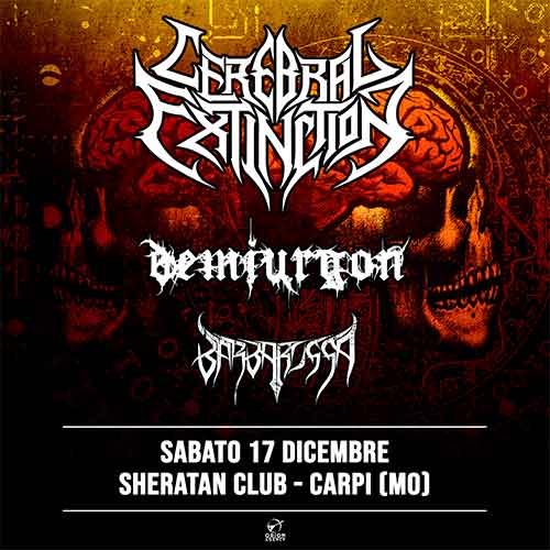 Domani, sabato 17 dicembre, sul palco dello Sheratan Live Club di Carpi (MO), andrà in scena il death metal tecnico e brutale. Headliner della serata saranno infatti i Cerebral Extinction, band italiana technical/brutal death metal in ascesa grazie al nuovo disco “Escape from Illusion” uscito lo scorso luglio via Amputated Vein Records e alla partecipazione a numerosi festival estivi europei estremi, assieme a band internazionali.