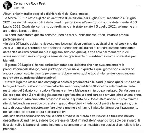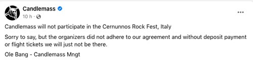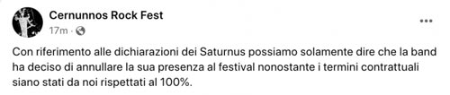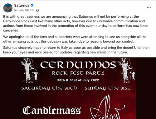 Prima di spegnere completamente la pagina social facebook del fest, il CERNUNNOS ROCK FEST risponde ai post di Candlemass e Saturnus, i quali notificano della loro non partecipazione all’evento a causa di insolvenza contrattuale degli organizzatori.