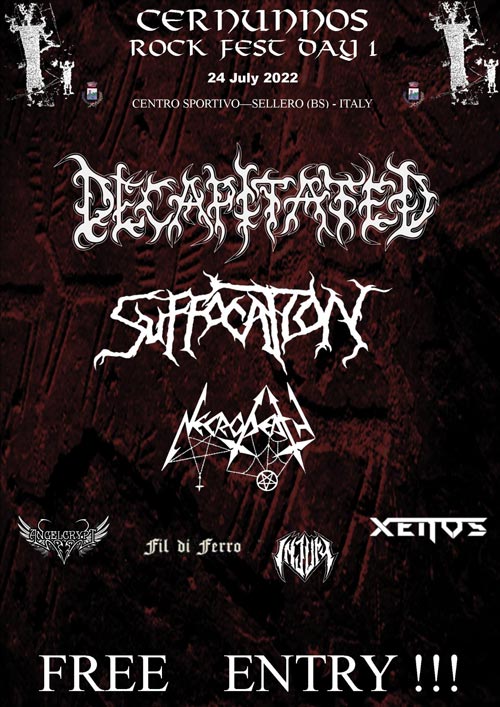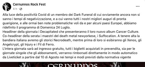 “Alla luce della positività Covid di un membro dei Dark Funeral di cui ovviamente ancora non si sanno i tempi di negativizzazione, e a cui vanno tutti i nostri migliori auguri di pronta guarigione, e alle ormai ben note problematiche voli da e per alcuni paesi Europei, abbiamo ridefinito il programma di Domenica 24 Luglio. Headliner della giornata i Decapitated che presenteranno il loro nuovo album Cancer Culture. Co-headliner della serata i maestri del death metal newyorkese, i Suffocation. A tenere alta la bandiera italiana avremo gli storici Necrodeath, mentre prima di loro si esibiranno gli Xenos, gli Angelcrypt, gli Injury e i Fil di Ferro. L’intera giornata sarà ad ingresso gratuito, tutti i biglietti acquistati in prevendita, sia per le giornate singole che gli abbonamenti, verranno rimborsati direttamente in modo automatico da Liveticket a partire dal 10 di Agosto nei tempi e modi previsti dalla normativa vigente”