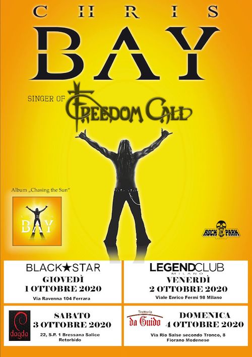 A proposito del suo disco solista Chris Bay afferma: “è stato un momento estremamente emozionante della mia vita lavorare su questo album e sono molto felice di dire che i miei sogni, senza dubbio, si sono avverati”; siete tutti invitati quindi a partecipare a queste fantastiche date che vedranno in scaletta non solo i brani del suo disco solista ma anche i più grandi successi dei Freedom Call: