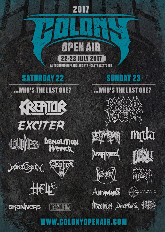 La nostra passione per il metal rimane intatta, come già detto molte volte siamo disposti tranquillamente ad utilizzare gli incassi dell’Open Air per continuare con il progetto Colony, quindi restiamo fiduciosi in un successo dell’Open Air per tornare ad avere una programmazione metal a 360° o quasi, noi ce l’abbiamo messa tutta per fare un bill “metal” al 110%, adesso, come si suol dire, aspettiamo l’insindacabile verdetto del pubblico.