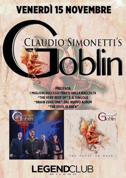 Claudio Simonetti’s Goblin al Legend Club di Milano venerdì 15 novembre. In questa occasione Simonetti e gli altri musicisti ripercorreranno le tappe della loro carriera con uno show audio-visivo. Infatti la band suonerà dal vivo per due ore, mentre spezzoni tratti dai film scorrono sullo sfondo. Oltre al repertorio classico la band suonerà in anteprima alcune nuove tracce dal nuovo album, uscito proprio ieri, 10 Settembre 2019, “The Devil is Back”.