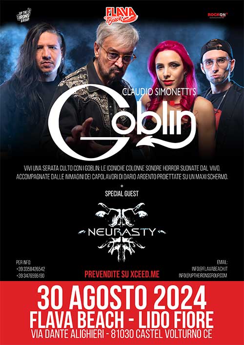 Venerdì 30 Agosto 2024 presso la splendida cornice del Flava Beach di Castel Volturno, si esibirà CLAUDIO SIMONETTI’S GOBLIN in concerto!