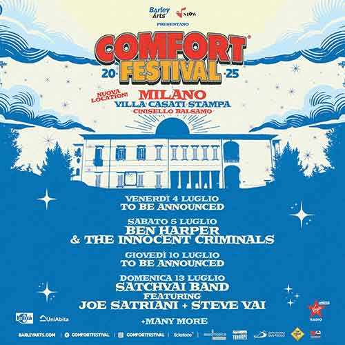 Il festival animerà diverse giornate del mese di luglio – per la precisione venerdì 4, sabato 5, giovedì 10 e domenica 13 – con una line-up internazionale ancora completamente da svelare. I primi nomi rivelati sono quelli di Ben Harper & The Innocent Criminals, previsti per sabato 5 luglio, e la SatchVai Band composta dai guitar heroes Joe Satriani e Steve Vai, che si esibiranno insieme sul palco del festival domenica 13 luglio. I biglietti per questi due concerti saranno disponibili in esclusiva sul circuito Ticketone dalle 10 di domani, venerdì 6 dicembre. Come sempre, Barley Arts invita a diffidare dai circuiti di vendita alternativi a quelli comunicati.