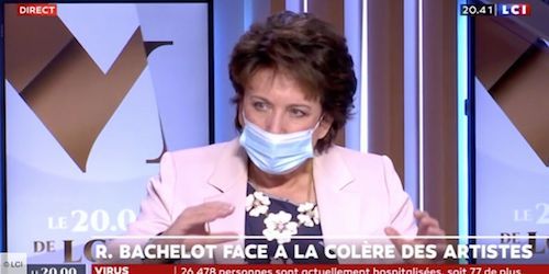 A meno di una situazione sanitaria catastrofica e con protocolli approvati, la ministra ha annunciato che si terranno due concerti da 1000 persone verso la metà di marzo al Dôme di Marsiglia, con «posti seduti con possibilità di alzarsi» e con il coinvolgimento dell’INSERM (‘Institut national de la santé et de la recherche médicale’). Tutte le persone saranno testate, con tampone, prima del concerto e i casi positivi «non saranno filtrati perché bisogna mettersi in situazione in cui ci sarà una mescolanza». Inoltre dei test saranno comunque svolti anche dopo l’evento per constatare cosa accadrà a livello di contaminazioni. Il tutto con maschere, obbligatorie, e gel distribuiti a tutti.
