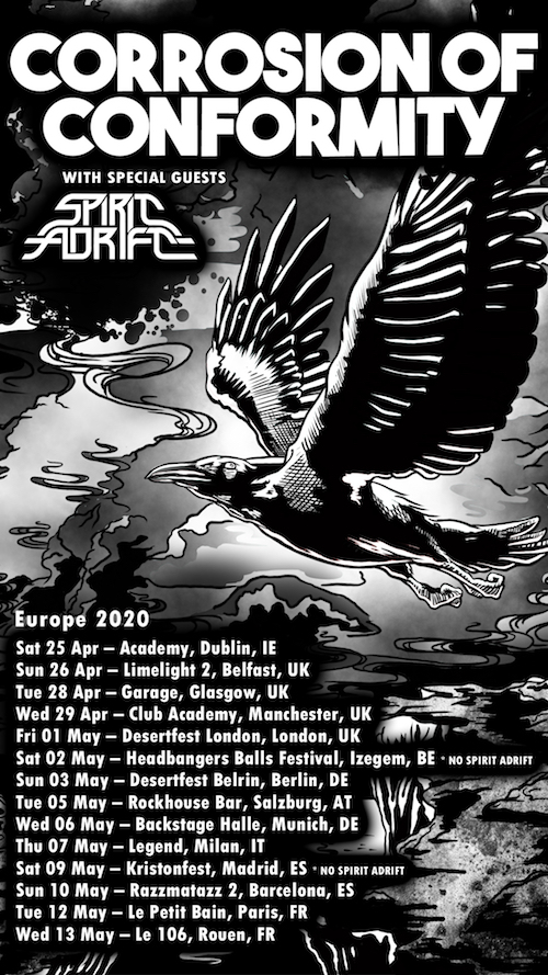 Ecco le date del tour europeo dei Corrosion Of Confomity, nel quale saranno accompagnati dai Spirit Adrift. Anche l’Italia è compresa nel tour: una sola data a Milano presso il Legend Club il 7 maggio.